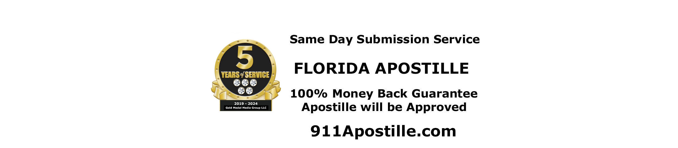 Gold Medal Media Group LLC dba 911Apostille.com Guarantees preparation of your documents for Florida Apostille submission; payment of State of Florida Apostille submission fees; in-person submission of your Documents, Photocopies, Florida Original Certificates or Florida Corporate Documents to Florida Apostille Division by Tallahassee Couriers; Email Digital copy of Apostille in pdf format the same day Apostille is retrieved from Florida Apostille Division; deliver Original Apostille to FedEx or DHL the same day Apostille is retrieved from Florida Apostille Division. Two-Day Domestic FedEx or DHL delivery of Original Apostille is included. Overnight or International delivery available (additional fee). We are not responsible for errors or delay by Florida's Department of State Division of Corporations Apostille Certification Section; delay by Tallahassee Couriers, delay by Customs or delay by FedEx or DHL. Our Couriers have submitted thousands of Documents, Photocopies, Florida Original Certificates and Florida Corporate Documents to the Florida Apostille Division. If there is a risk of rejection, we will inform you before accepting payment for in-person Florida Apostille submission service. No Apostille company can guarantee the Florida Department of State Division of Corporations Apostille Certification Section will Apostille Documents, Photocopies, Florida Original Certificates or Florida Corporate Documents. If Apostille submission is rejected for any reason we work with you and resubmit or refund 100% of fees. It is the responsibility of the individual requesting Remote Online Notary Same Day Florida Apostille submission service to confirm the third party requiring an Apostille will accept digital electronic signatures and do require INK or WET SIGNATURES on documents or photocopies. INK or WET SIGNATURES require notarization by a LOCAL FLORIDA NOTARY (you are responsible for local notary fees). POLICIES of Gold Medal Media Group LLC dba 911Apostille.com govern this transaction.